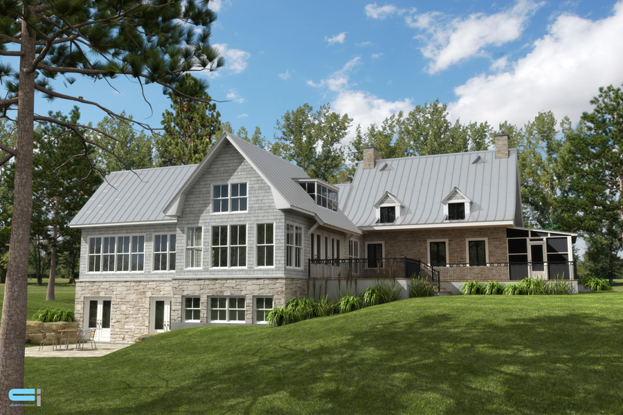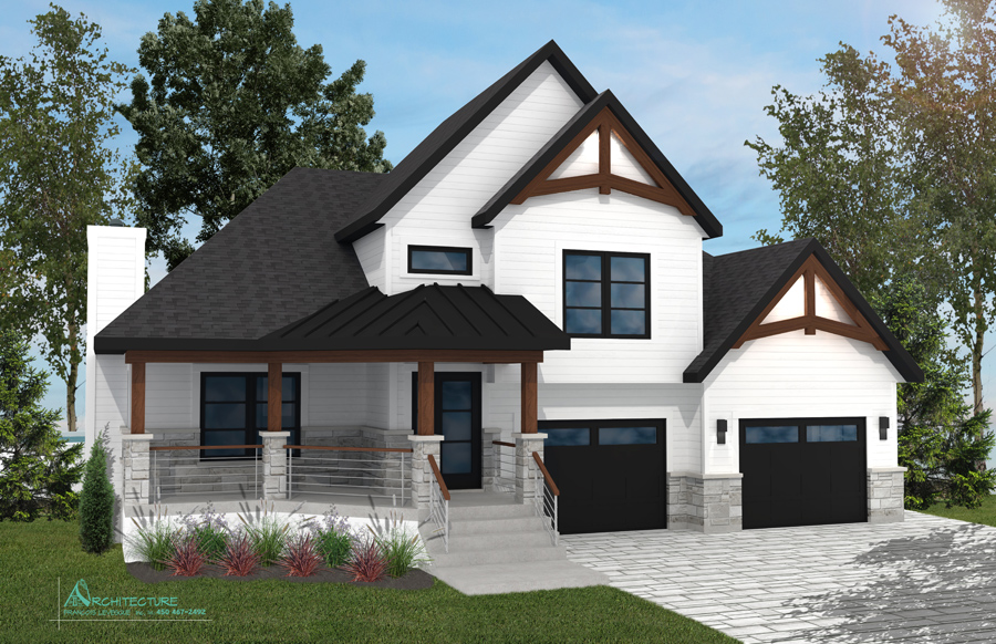 • Vue des quatre (4) élévations extérieures illustrant l'apparence finale incluant les détails des éléments architecturaux
